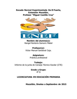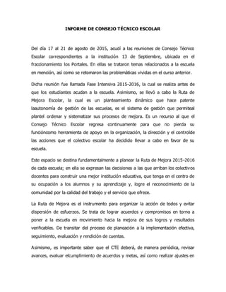 El resumen describe las reuniones del Consejo Técnico Escolar de la escuela 13 de Septiembre para planear el curso escolar 2015-2016. Se discutieron temas como la Ruta de Mejora Escolar, los objetivos para el año que incluyen lograr la normalidad escolar, reducir el rezago educativo y fomentar una convivencia pacífica. También se analizaron las necesidades de la escuela y se elaboraron instrumentos para una evaluación diagnóstica de los estudiantes.