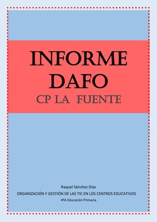 Este documento presenta un análisis DAFO sobre el uso de las TIC en un centro educativo. Identifica debilidades como recursos limitados y antiguos, y amenazas como mal funcionamiento de internet. También destaca fortalezas como la diversidad de recursos y el conocimiento de los profesores, y oportunidades como ayudas económicas potenciales. El análisis concluye que los mayores retos son los recursos limitados, pero que las TIC son un complemento diario a pesar de las dificultades. Se proponen mejoras como curs