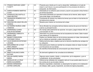 Este documento presenta las notas y logros de 51 estudiantes de un curso de Tecnología e Informática. Reporta el número de fallas de cada estudiante, sus notas de 1 a 10 y un breve resumen de sus logros o áreas de mejora. Algunos estudiantes mostraron un alto interés y lograron identificar herramientas de internet, mientras que otros tuvieron dificultades conceptuales o poco compromiso con la asignatura.