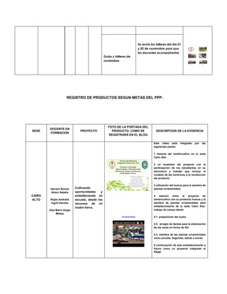 El documento resume las actividades complementarias realizadas por tres docentes en formación según su agenda de trabajo. Alizon Herrera realizó una salida pedagógica a la biblioteca Germán Arciniegas. Ingrid Daniela Rojas realizó tres misas de una hora cada una como parte de un convenio. Angie Melisa Díaz organizó una jornada de cultura con deportes, manualidades y recreaciones para integrar a la comunidad.