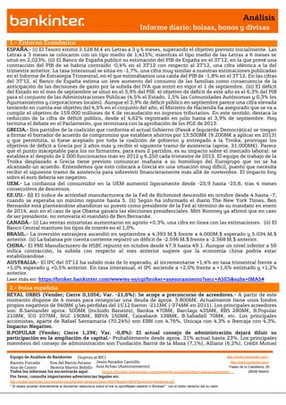 El documento resume la situación económica y financiera en España e internacionalmente. En España, el Tesoro emitió deuda pública con tipos bajos, el PIB cayó un 0,4% en el tercer trimestre y el déficit público fue del 3,9% en septiembre. En Grecia, dos partidos de la coalición gobernante se niegan a firmar un acuerdo de austeridad propuesto por la Troika. Internacionalmente, los resultados empresariales decepcionantes pesaron en las bolsas, mientras que los datos macroeconómicos