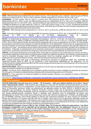 El documento resume la situación económica y financiera del día, incluyendo datos macroeconómicos débiles en la UE como los PMIs manufacturero y de servicios en Alemania y Francia. También cubre noticias como la emisión de bonos alemanes, comentarios de Merkel sobre un presupuesto central de la eurozona, y datos de Estados Unidos como ventas de vivienda y la decisión de la Fed de mantener tasas sin cambios. El análisis espera una sesión mixta en bolsas ante datos económicos contradictorios.