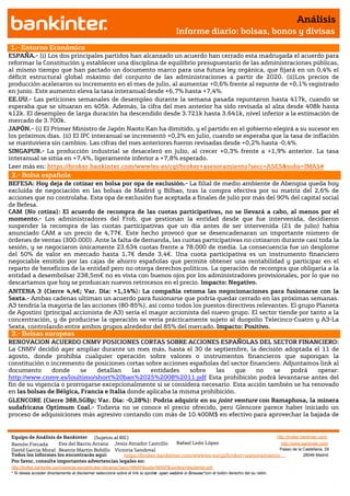 El documento resume las noticias económicas y de mercados del día, incluyendo el desempeño negativo de las bolsas europeas y estadounidenses debido a factores como la desaceleración del consumo en Europa y el aumento de solicitudes de desempleo en EEUU. El mercado espera con interés los discursos de Bernanke en la reunión de Jackson Hole para obtener pistas sobre posibles medidas de estímulo de la Reserva Federal.
