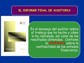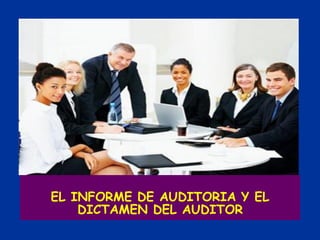 El informe de auditoría presenta la opinión del auditor sobre la confiabilidad de los estados financieros tras su revisión. Detalla pasos a seguir antes de elaborar el informe y clasifica los tipos de informes en corto y largo, especificando su estructura y contenido esencial. Además, describe tipos de dictámenes, incluyendo favorables, con salvedades, y adversos, así como las condiciones bajo las cuales se emiten.