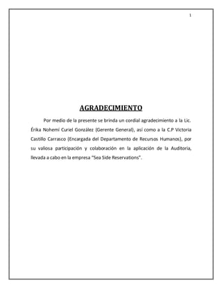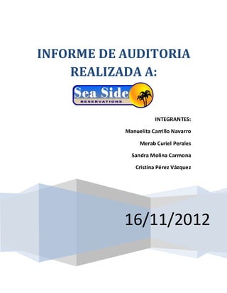 El resumen analiza el informe de auditoría realizada al departamento de recursos humanos de la empresa Sea Side Reservations. Se evaluaron procesos como selección, reclutamiento, contratación, inducción, capacitación, relaciones laborales, seguridad e higiene y nómina. Se proporcionaron recomendaciones para mejorar cada proceso, como aplicar exámenes médicos en la selección o crear una bolsa de trabajo interna para el reclutamiento.
