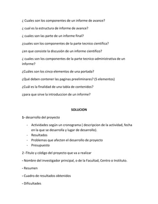El documento describe los componentes y estructura de informes de avance e informes finales. Explica que un informe de avance incluye el desarrollo del proyecto según un cronograma, resultados, problemas y presupuesto. Un informe final contiene una introducción, métodos, resultados y discusión. También detalla los componentes de la parte técnico-científica como hipótesis, análisis de datos y corroboración de hipótesis. Finalmente, enumera elementos como portada, índice, introducción y bibliografía que deben incluir