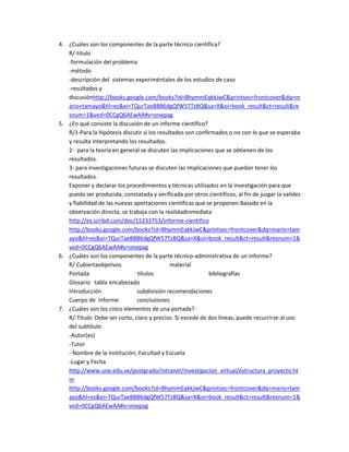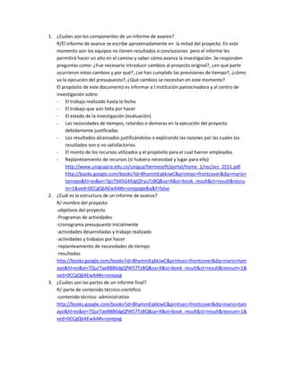 Los componentes de un informe de avance incluyen el trabajo realizado hasta la fecha, el trabajo pendiente, el estado de la investigación, los resultados obtenidos y los recursos utilizados. El propósito del informe de avance es informar al patrocinador y al centro de investigación sobre el progreso del proyecto hasta la mitad de su duración.