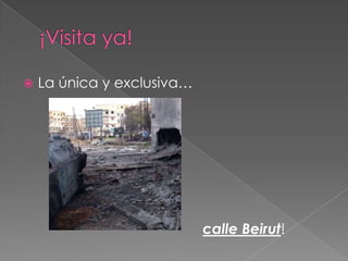 El documento habla sobre la situación en la ciudad de Beirut, Líbano. Menciona que las calles están en mal estado con cráteres de obuses y tiroteos. También hay estrenos de películas americanas y largas filas para ingresar a eventos, aunque los taxis son el único medio de transporte y son caros. Finalmente, menciona que el gobierno está a cargo de Gemayel y la población libanesa.