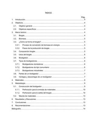 Este documento describe el diseño y construcción de un biodigestor para generar biogás a partir de desechos orgánicos como cáscara de pacay y estiércol de oveja, cerdo y aves. Se detallan los materiales utilizados como un tanque de 60 litros, tubos PVC y válvulas. La metodología incluye perforar orificios en la tapa del tanque para la entrada y salida, unir las piezas con pegamento y sellar con silicona. El biodigestor permitirá procesar los desechos y producir