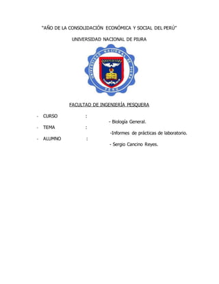 Este documento presenta un resumen de la primera práctica de laboratorio de un curso de Biología General sobre biosguridad y microscopía. Explica los diferentes niveles de biosguridad, partes de un microscopio y cómo usarlo correctamente, así como normas básicas de seguridad en el laboratorio.