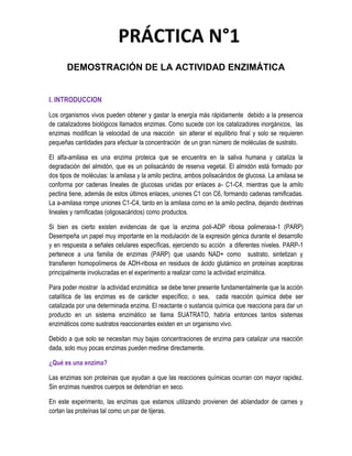 Este documento describe un experimento para demostrar la actividad enzimática de la alfa-amilasa. La alfa-amilasa es una enzima que cataliza la degradación del almidón en maltosa y glucosa. El experimento involucra la incubación de una solución de almidón con y sin alfa-amilasa, luego la detección de productos o sustratos residuales usando indicadores químicos. El objetivo es mostrar cómo la presencia de la enzima alfa-amilasa causa cambios químicos que no ocurren en su ausencia, demo