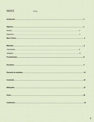 Este informe de laboratorio presenta 3 objetivos: 1) conocer y aplicar normas de seguridad al manipular muestras, materiales y equipos de laboratorio, 2) dar un uso adecuado a dichos materiales y equipos, y 3) lograr resultados a través de buenos procedimientos. Describe normas de bioseguridad, materiales comunes de laboratorio e instrumentos como vasos de precipitado, tubos de ensayo, pipetas y buretas.