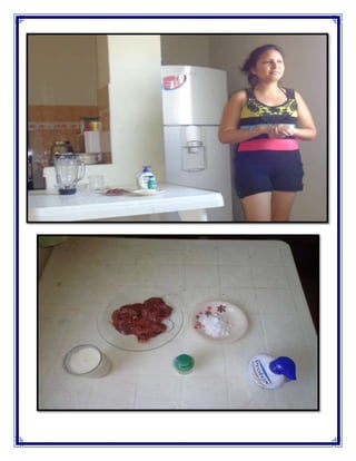 Este documento describe un experimento realizado por estudiantes de enfermería para observar el ADN de forma casera. El procedimiento incluyó licuar hígado de pollo, agregar detergente y enzimas para romper las células, y luego añadir alcohol para separar el ADN de las proteínas. Los estudiantes pudieron observar filamentos blancos de ADN dentro del alcohol, demostrando que el método permitió extraer y visualizar el ADN de manera sencilla y económica.