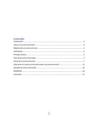 Este documento proporciona información sobre el estilo de las cartas comerciales. Explica qué es una carta comercial, sus objetivos e importancia. Luego describe los principios básicos, tipos y partes de una carta comercial, incluido el membrete, fecha, datos del destinatario, asunto, saludo, texto, despedida y firma. También ofrece consejos sobre cómo escribir una carta comercial de manera clara, formal y cortés.