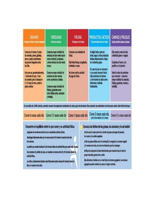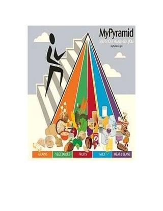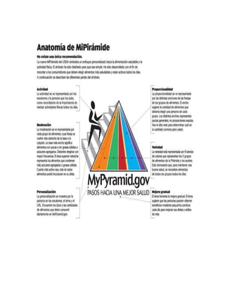 El documento presenta la pirámide de alimentos actualizada conocida como "Mi Pirámide". Explica que representa los grupos alimenticios con seis colores y recomienda consumir más frutas, verduras, granos y productos lácteos. Además, aconseja limitar el sodio, azúcar y realizar 30 minutos de ejercicio diario para mantener una dieta y estilo de vida saludables.