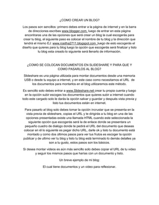 Para crear un blog, primero se debe ingresar a www.blogger.com y crear una cuenta. Luego, se debe colocar el nombre y la dirección del blog, como www.nombreblog.blogspot.com, y seleccionar un diseño. Para agregar documentos, se suben a SlideShare (www.slideshare.net) y se toma el URL para insertarlo en el blog a través de la opción HTML. De manera similar, se puede agregar videos copiando su URL.