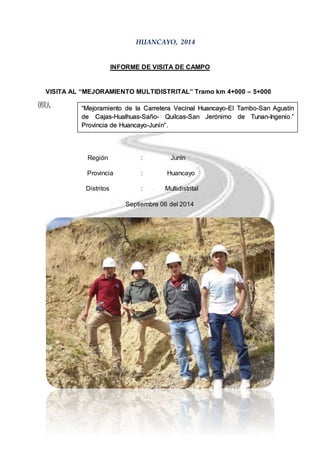 Este documento presenta el informe de una visita de campo realizada el 6 de septiembre de 2014 para verificar las obras de mejoramiento de la carretera vecinal Huancayo-El Tambo-San Agustín de Cajas-Hualhuas-Saño-Quilcas-San Jerónimo de Tunan-Ingenio en la provincia de Huancayo, Junín. El informe describe las mediciones tomadas en el tramo entre los km 4+000 a 5+000, incluyendo anchos de calzada, cunetas y obras de arte. Los resultados mue