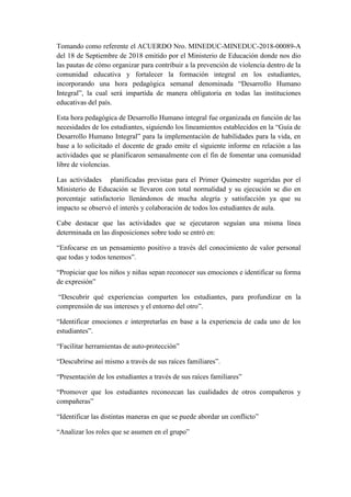 El informe resume las actividades realizadas durante el primer quimestre del 2018-2019 en la asignatura de Desarrollo Humano Integral en el séptimo grado de la Unidad Educativa “Manuel Gonzalo Albán Rumazo”. Se llevaron a cabo diversas dinámicas grupales con el objetivo de desarrollar habilidades como el autoconocimiento, manejo de emociones, empatía, resolución de conflictos y toma de decisiones. El informe concluye que las actividades cumplieron con los lineamientos del Ministerio de Educación y contrib