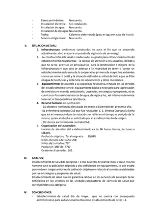 El informe resume la situación del Puesto de Salud Primero de Mayo, notando que (1) carece de infraestructura adecuada y servicios básicos, (2) tiene recursos humanos insuficientes para la población asignada, y (3) carece de equipamiento médico básico. Se recomienda (1) mejorar la infraestructura mediante la construcción de un nuevo local o el alquiler temporal de uno mejor, (2) asignar más recursos humanos, y (3) dotarlo de equipamiento e insumos médicos según su
