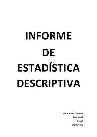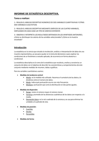 Este informe presenta un análisis estadístico descriptivo de cuatro variables, dos cuantitativas y dos cualitativas, de una muestra de datos. Se calculan medidas de tendencia central, dispersión y posición para las variables cuantitativas, y se muestran las frecuencias de las variables cualitativas en tablas y gráficos. Los resultados muestran que la mayoría de los participantes reportan una comunicación familiar moderada y un nivel medio de medicalización, raramente consumen hachís, y usualmente usan preservativos