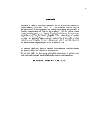 Este documento presenta el informe de gestión del año 2007 del Instituto Superior Pedagógico Público "Santa Cruz". Resume las principales actividades administrativas, técnico pedagógicas, de proyección social e infraestructura realizadas durante el año, evaluando su nivel de logro. Concluye que se cumplió con la elaboración y difusión de documentos de gestión, aunque se necesita mejorar la suscripción de convenios. Las actividades de mantenimiento e infraestructura alcanzaron un buen nivel, aunque se requ
