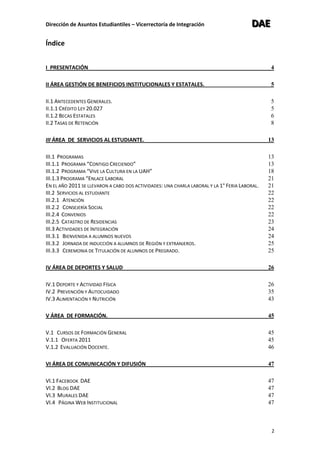 El informe resume las actividades y logros de la Dirección de Asuntos Estudiantiles de una universidad durante el año 2011. La dirección gestionó beneficios para 3,224 estudiantes, un aumento de 6.1 puntos porcentuales con respecto al año anterior. Ofreció varios programas y servicios para apoyar a los estudiantes. También se destacan las tasas de retención y los esfuerzos de comunicación e integración con las organizaciones estudiantiles.