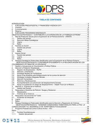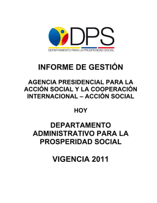 Este informe resume la gestión y ejecución de programas de la Agencia Presidencial para la Acción Social y la Cooperación Internacional durante el año 2011. Se destacan logros en la atención a población vulnerable como desplazados y víctimas, y en programas para la superación de la pobreza extrema. También se resaltan avances en generación de empleo e infraestructura rural, aunque se identifican retos en la sostenibilidad de algunas iniciativas. Finalmente, el informe concluye evaluando riesgos y oportun