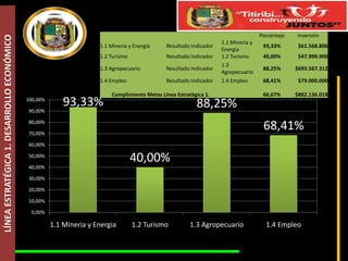Este documento presenta los resultados de las líneas estratégicas de desarrollo económico del municipio de Titiribí para el alcalde Diego Antonio Montoya Taborda. Se resumen los porcentajes de cumplimiento e inversión en minería, turismo, agropecuario y empleo, siendo los mayores en minería y energía y turismo. También se destacan algunos proyectos realizados en cada sector.
