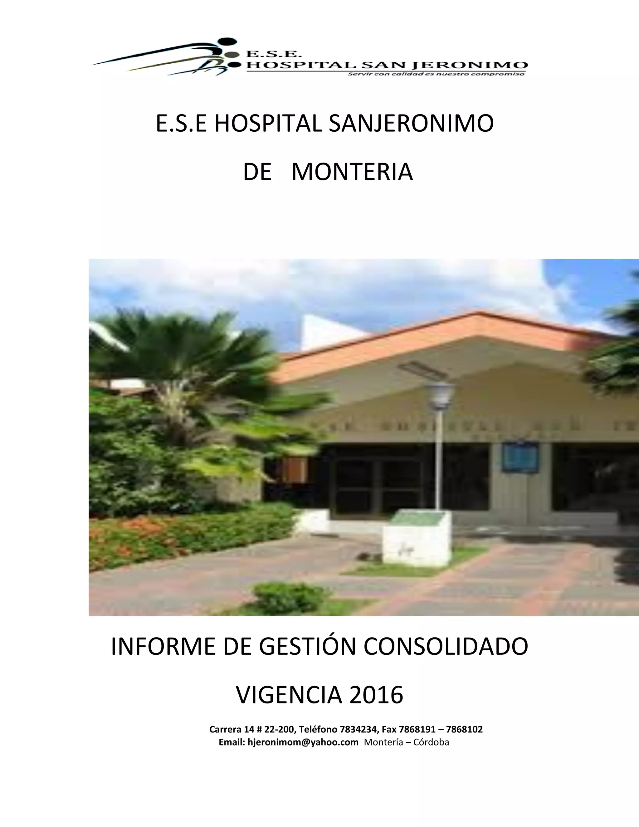 El documento presenta el informe de gestión consolidado de la ESE Hospital San Jerónimo de Montería para el año 2016. Incluye información sobre la justificación, objetivos y actividades realizadas por el área de planeación durante ese año. Se resumen los planes de acción anuales elaborados por las diferentes dependencias de la institución, así como los avances obtenidos en la coordinación y consolidación de dichos planes. También se describe el marco legal y la plataforma estratégica que rige la planeación de la ESE.