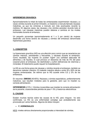 El documento describe la hiperemesis gravídica, una afección grave de náuseas y vómitos durante el embarazo. Se caracteriza por vómitos intensos y frecuentes que impiden la alimentación adecuada de la mujer embarazada, causando deshidratación y deficiencias. Afecta al 1-2% de los embarazos y su tratamiento puede requerir hospitalización para rehidratación y administración de medicamentos.