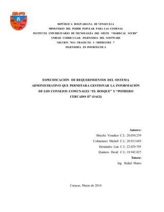 Este documento presenta la especificación de requerimientos para el desarrollo de un sistema administrativo (SAGI) que permita gestionar la información de los Consejos Comunales "El Bosque" y "Potrero Cercado II". El SAGI tendrá como objetivo administrar datos de las comunidades, cursos, censos y emitir cartas. Beneficiará la comunicación entre los voceros y proporcionará información a los habitantes de manera remota.