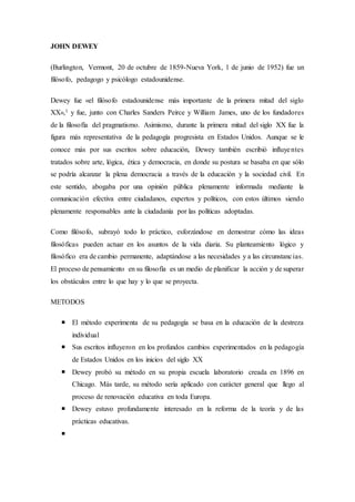 John Dewey fue un filósofo, pedagogo y psicólogo estadounidense que fue una figura clave en el desarrollo del pragmatismo y la pedagogía progresista. Creía que la educación debía estar basada en la experiencia y la resolución de problemas de la vida real para los estudiantes. Probó sus métodos en su propia escuela experimental en Chicago, donde los estudiantes aprendían a través de la acción y la resolución colaborativa de problemas. Sus escritos influyeron profundamente en la reforma educativa en Estados Unidos