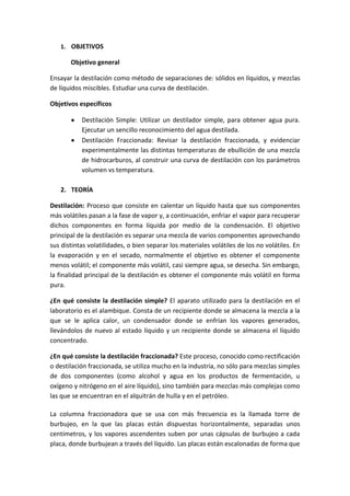 Este documento describe los procedimientos para realizar destilación simple y fraccionada. La destilación simple se utilizó para obtener agua destilada a partir de agua potable, mientras que la destilación fraccionada se empleó para separar los componentes de una mezcla de hidrocarburos mediante la construcción de una curva de destilación. El documento también explica la teoría subyacente a estos métodos de separación y proporciona conclusiones y recomendaciones sobre los resultados obtenidos.