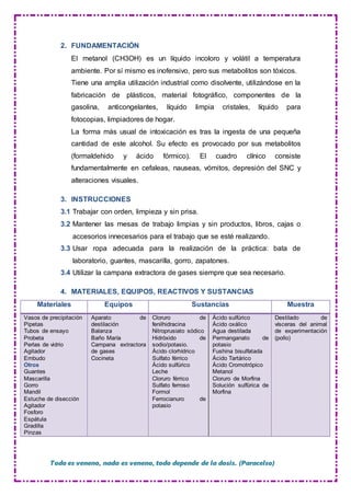 Este documento describe una práctica de laboratorio sobre la intoxicación por metanol realizada por una estudiante de bioquímica y farmacia. La estudiante administró metanol a las vísceras de un pollo y luego destiló y analizó el destilado usando varias pruebas químicas para identificar la presencia de metanol. Todas las pruebas químicas dieron resultados positivos excepto una, indicando que el metanol fue identificado correctamente en el destilado de las vísceras.