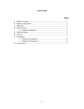 Este informe de laboratorio describe el objetivo de analizar y construir circuitos lógicos utilizando compuertas AND, OR y NOT. Incluye la teoría sobre cada tipo de compuerta, una tabla de verdad con 16 entradas y la validación experimental de dos circuitos usando compuertas AND y OR. El informe concluye que las compuertas lógicas juegan un papel fundamental en el desarrollo de circuitos eléctricos y que la tabla de verdad muestra todas las posibles salidas.