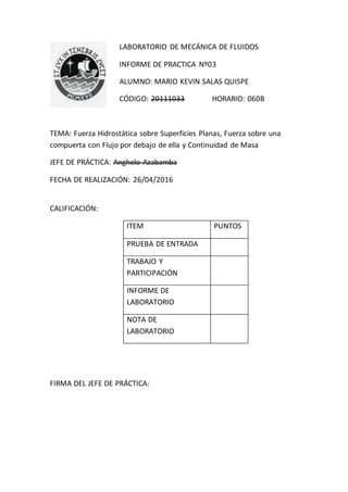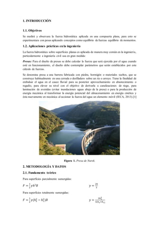 1) Se midió la fuerza hidrostática aplicada a una compuerta plana colocada en un canal de flujo, midiendo la presión en diferentes puntos y calculando la fuerza total. 2) La fuerza depende de factores como la altura del agua, la abertura de la compuerta y la distribución de presiones. 3) Los resultados muestran la fuerza total ejercida y su variación con la distancia a la compuerta, lo que es útil para el diseño de estructuras como presas y desagües
