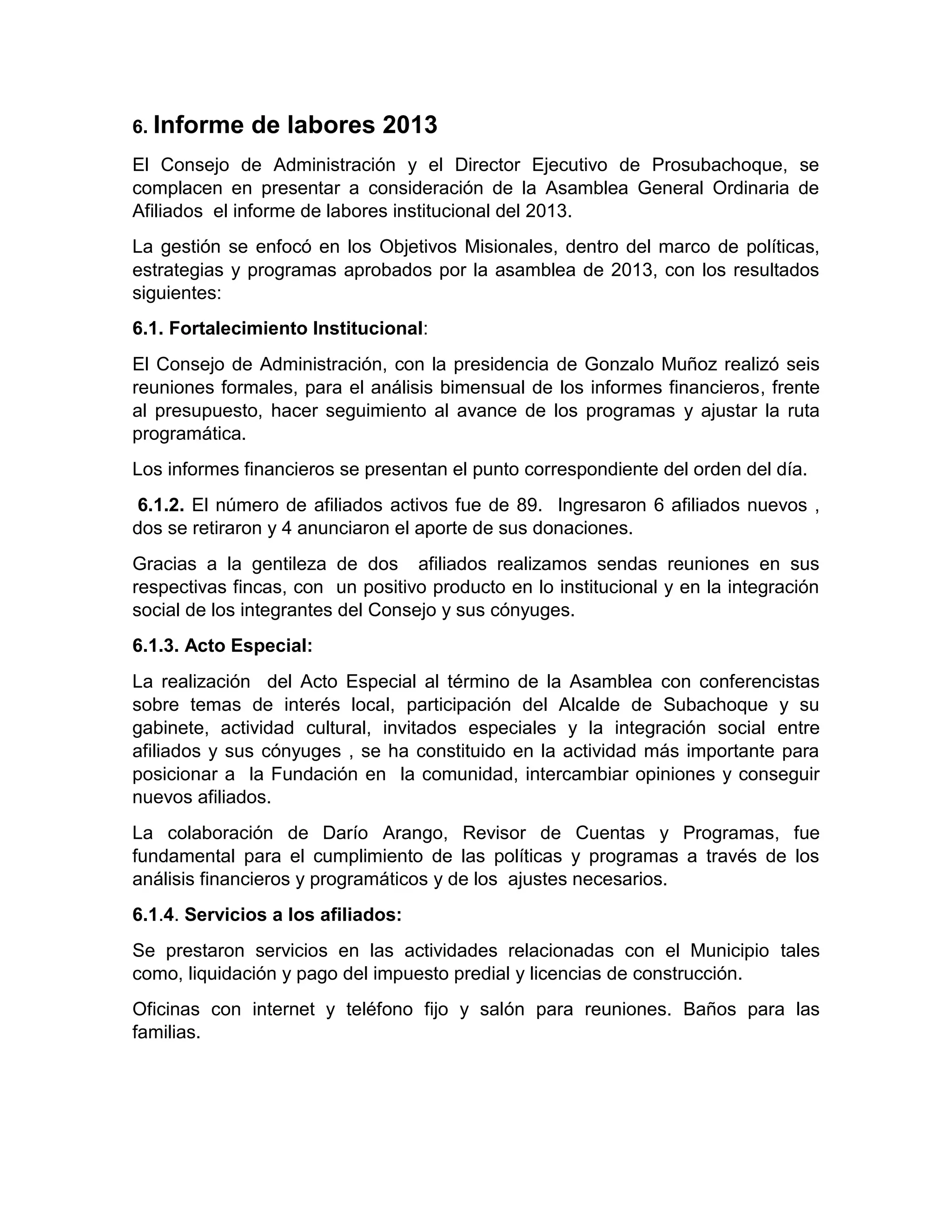 El informe resume las actividades y logros de Prosubachoque en 2013, enfocándose en el fortalecimiento institucional, las comunicaciones, las actividades colaborativas con la alcaldía municipal en áreas como el medio ambiente, vías, servicios públicos, educación, seguridad y veeduría ciudadana. Algunos logros clave incluyen el aumento en el número de afiliados, mejoras en la emisora comunitaria, aumento en visitas al sitio web, y colaboración con la alcaldía en proyectos como el "