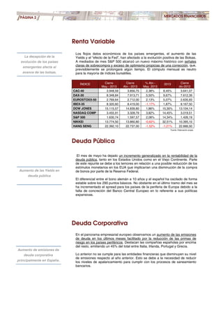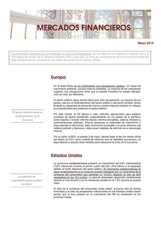 La recuperación económica en la zona euro continúa siendo gradual y liderada por Alemania, mientras que el sector exterior sigue siendo clave para la recuperación debido a la limitada capacidad de demanda interna en la mayoría de los países. El BCE ha bajado las tasas de interés al 0.5% y estudia medidas adicionales para estimular el crédito a empresas. Por otro lado, los mercados financieros han mostrado avances moderados debido a los datos económicos decepcionantes de los países emergentes.