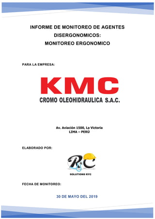 Este informe presenta los resultados del monitoreo de riesgos disergonómicos realizado en una empresa. Se evaluaron los puestos de trabajo en las áreas administrativa y operativa utilizando los métodos Ergo IBV y REBA. Se encontraron varios factores de riesgo relacionados principalmente con la postura y el mobiliario. Se recomienda implementar pausas activas, mejorar las sillas y mesas, y capacitar a los trabajadores sobre ergonomía.