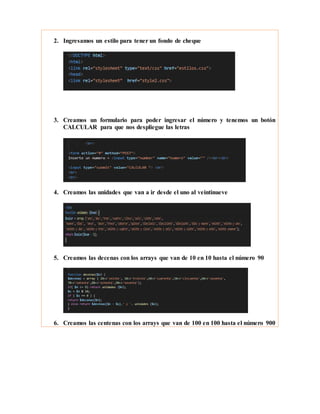 El documento presenta un informe de grupo sobre ejercicios con arrays en PHP. El objetivo era realizar un ejercicio que convierta números a letras utilizando arrays. Los estudiantes crearon arrays unidimensionales para representar unidades, decenas, centenas, miles y millones, y desarrollaron un formulario en PHP para ingresar un número y mostrar la conversión a letras al presionar un botón.
