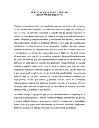 El documento describe las prácticas de lenguaje en un aula de segundo grado. La maestra guía a los estudiantes en el proceso de lectura y escritura, les pide que analicen instrucciones y cuentos, y discutan lo que han leído. La maestra también incorpora la lengua mayo-yoreme en algunas actividades. Evalúa a los estudiantes considerando su participación individual y grupal, así como sus evaluaciones bimestrales. La biblioteca del aula permite a los estudiantes leer una variedad de textos e inform
