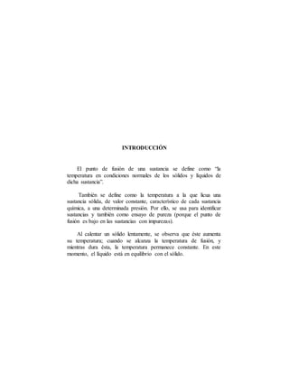 Este documento presenta los detalles de un experimento de laboratorio para determinar el punto de fusión del ácido benzoico. El objetivo era medir la temperatura a la que el ácido benzoico cambia de estado sólido a líquido. Los estudiantes pulverizaron el ácido benzoico, lo colocaron en un capilar y lo calentaron en un baño de aceite mientras monitoreaban la temperatura. Determinaron que el punto de fusión del ácido benzoico es de aproximadamente 124°C, lo que indica que es una sustancia pura.