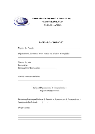 El documento describe el informe de pasantía de un estudiante de la Universidad Nacional Experimental 'Simón Rodríguez', donde detalla las actividades realizadas en el Instituto Autónomo de Infraestructura del Estado Apure. Durante el periodo de pasantía, el estudiante participó en diversas áreas como orden de compras, pagos, contabilidad y planificación, adquiriendo experiencia práctica en la administración pública. El informe incluye agradecimientos a familiares, compañeros y tutores, así como un diagnóstico de las actividades y el cumplimiento de objetivos establecidos.
