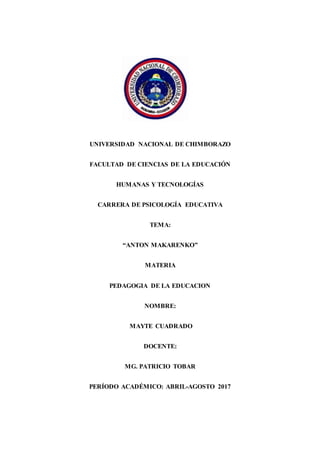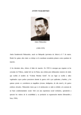 Anton Makarenko fue un pedagogo ruso que creó un sistema educativo innovador basado en su experiencia dirigiendo una colonia para jóvenes delincuentes. Makarenko creía que los adolescentes se vuelven malos debido a una falta de condicionamiento social positivo y que solo mediante una verdadera experiencia social podrían aprender a valorar la sociabilidad. En la colonia Gorki que dirigió, Makarenko reeducó a los jóvenes a través de una dedicación constante, restaurando su dignidad humana y social. Su obra más