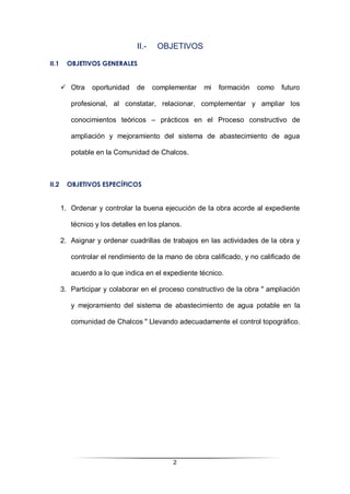El documento describe un proyecto para mejorar y ampliar el sistema de agua potable en la localidad de Chalcos en Perú. El proyecto tenía como objetivo principal proveer agua potable las 24 horas del día a la población. Se construyó un nuevo reservorio, se rehabilitó la línea de conducción y se amplió la red de distribución. El proyecto también buscaba fortalecer las organizaciones comunales que administran el sistema de agua.