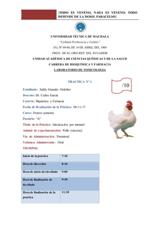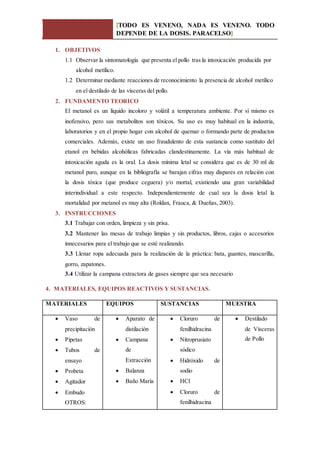 Este documento presenta un informe de laboratorio sobre una práctica de toxicología que involucra la intoxicación de un pollo con metanol. Se administró metanol al pollo y se observaron los síntomas. Luego, las vísceras del pollo se destilaron y las muestras del destilado se sometieron a pruebas químicas que confirmaron la presencia de metanol a través de varias reacciones características. El documento proporciona detalles sobre los procedimientos, materiales, resultados y conclusiones de la prá