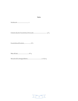 [1] La escuela primaria "Prof. José Antonio Sarabia López" ofrece educación primaria a aproximadamente 400 estudiantes en Mazatlán, Sinaloa. [2] El documento describe el contexto educativo de la escuela, incluidas las características de los estudiantes y las estrategias didácticas utilizadas por la autora durante sus prácticas de enseñanza sobre alimentación saludable. [3] La autora concluye que la escuela proporciona un entorno seguro y de apoyo para los estudiantes.