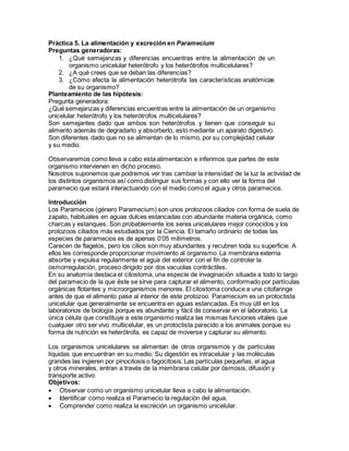 Este documento describe un experimento realizado por estudiantes para observar la alimentación y excreción en Paramecium. Los estudiantes observan Paramecium ingiriendo partículas de carmín y expulsándolas a través de sus vacuolas contráctiles. Además, identifican estructuras como el citostoma, citofaringe y vacuolas que permiten a estos organismos unicelulares alimentarse y regular su contenido de agua.