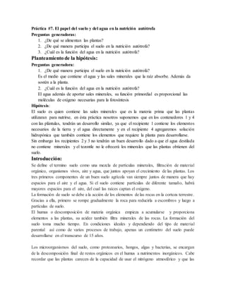 Este documento describe un experimento sobre el papel del suelo y el agua en la nutrición autótrofa de las plantas. Se cultivaron plántulas de soya en cuatro contenedores con diferentes sustratos: 1) tierra y agua de la llave, 2) tezontle y agua destilada, 3) tezontle y agua de la llave, y 4) solución hidropónica. Los resultados mostraron que las plántulas crecieron mejor en los contenedores 1 y 4, indicando que tanto el suelo como las sales minerales en
