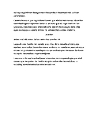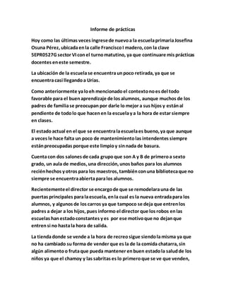 Este informe describe una escuela primaria en Mazatlán, México donde el autor realiza prácticas docentes. La escuela se encuentra en buenas condiciones a pesar de estar alejada y servir a una comunidad con contexto desfavorable. Cuenta con dos salones por grado, áreas comunes y servicios recientemente remodelados. Sin embargo, la tienda de la escuela vende principalmente comida chatarra y los niños ya no reciben bolsas de fruta del DIF. La matrícula ha disminuido de 38 a 34 alumnos debido a